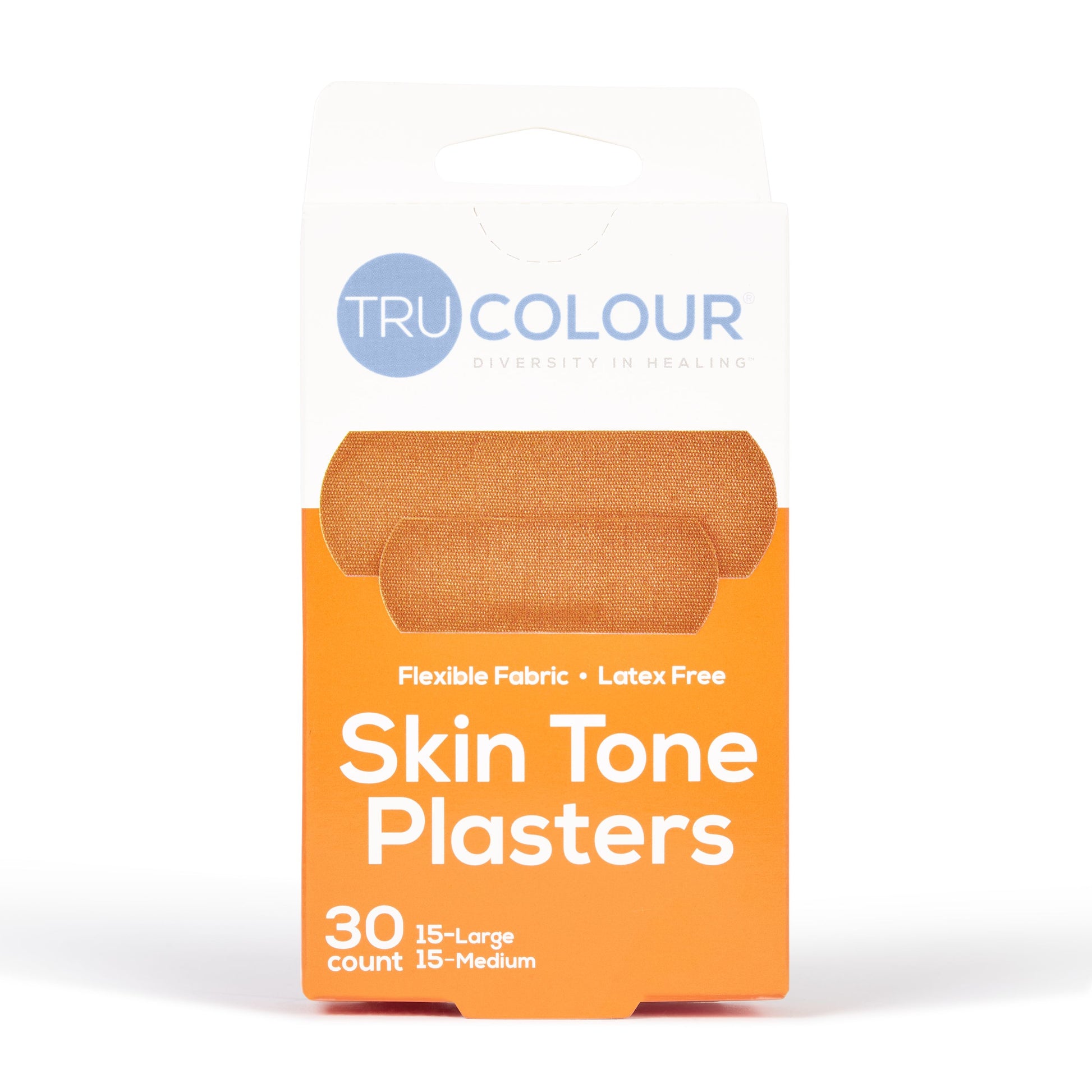 Tru-Colour Skin Tone Plasters in the colour Brown. These Latex-free plasters are made to blend with brown to dark brown skin tone shades. The Flexible fabric allows for increased movement while wearing Individual, sterilized wrappers. Each pack includes 15 medium and 15 large plasters.